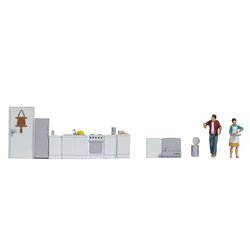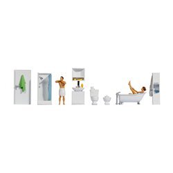 Noch's interior range doesn't stop there: they've thought of every room in the house! The 'Kitchen' set brings culinary life to your models with a woman cooking and a man holding a drink, alongside detailed kitchen units, cooker, sink, fridge and extractor fan. The 'Bedroom' set shows everyday domestic life with a man getting dressed and a woman folding laundry, complete with bed, bedside tables, wardrobe and dressing table. Rounding off the collection, the 'Bathroom' set features a man with a towel and a woman relaxing in the bathtub, with shower, toilet, bidet, washbasin and bathroom cabinet all included. Each of these sets is meticulously hand-painted and includes a door, making them perfect for creating detailed interior scenes visible through the windows of your model buildings.
