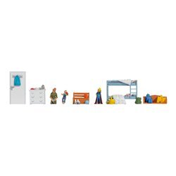 Whilst outdoor scenes are brilliant fun to create, you might also want to show what's happening inside the buildings on your layout. Noch has developed a superb range of themed interior sets that include both figures and furniture. Their 'Dining Room' set is particularly charming, featuring a family of four with a fully laid table, chairs, shelf, chest of drawers and even a door: everything you need to create a cosy family mealtime scene. The 'Children's Room' set captures the playful chaos of family life with a mother, two children, a bunk bed, chest of drawers and various toys. For a more relaxed atmosphere, the 'Living Room' set depicts a man in an armchair and a couple on the sofa, complete with wall unit, coffee table and television.